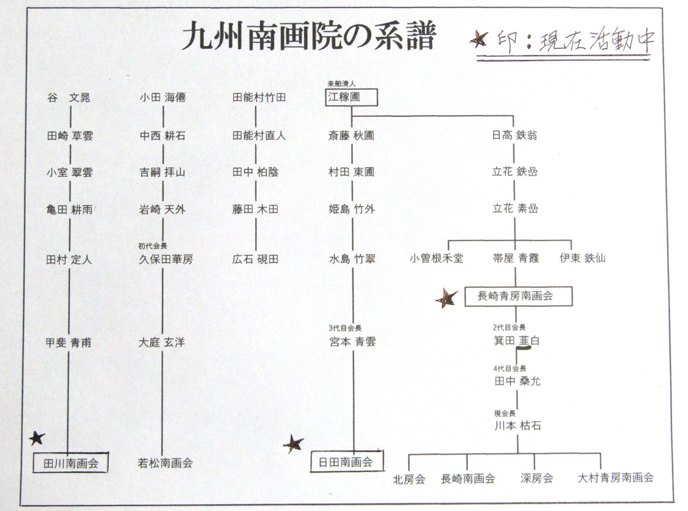 後に同会の主旨に賛同して、田能村竹田系の「木付南画会」、また僧鉄翁系の「長崎派南画」が加盟して、現在の「九州南画院」となりました。
